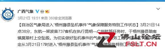 據(jù)廣西壯族自治區(qū)氣象局官方微博消息,3月21日14點38分,東航一架波音737客機在執(zhí)行昆明—廣州航班任務時,于梧州藤縣瑯南鎮(zhèn)莫瑯村上空墜毀。