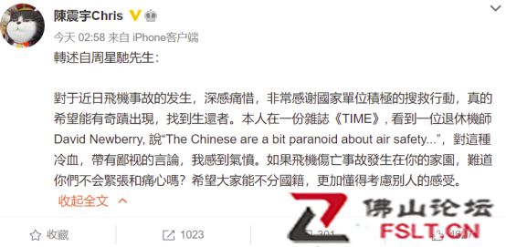 陳震宇23日凌晨近3時在微博轉(zhuǎn)述了周星馳對東航墜機(jī)事件的一段話。