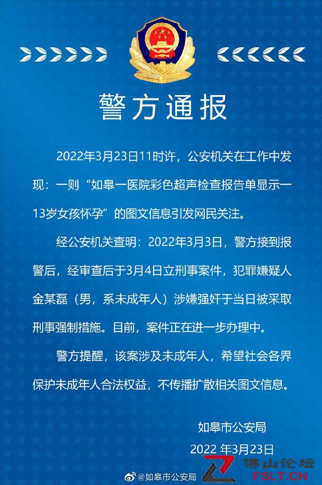 2022年3月23日11時許,公安機關(guān)在工作中發(fā)現(xiàn):一則“如皋一醫(yī)院彩色超聲檢查報告單顯示一13歲女孩懷孕”的圖文信息引發(fā)網(wǎng)民關(guān)注。
