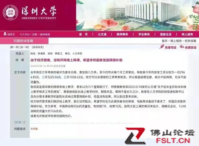 據(jù)科學(xué)網(wǎng)消息,3月20日,深圳大學(xué)人文學(xué)院教職工陳星群在學(xué)校網(wǎng)站留言稱,“由于我經(jīng)濟(jì)困難,沒錢開網(wǎng)絡(luò)上網(wǎng)課,希望學(xué)校能夠發(fā)放網(wǎng)絡(luò)補(bǔ)助”。