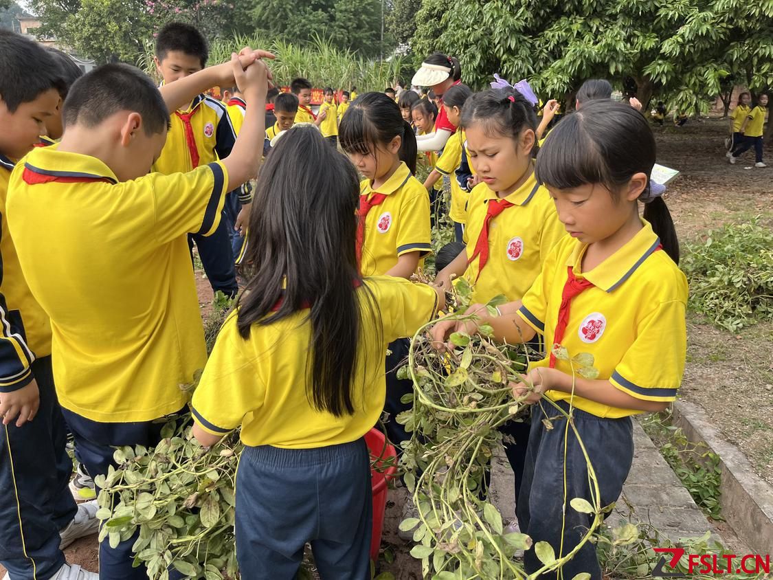另一邊,花生地也一片忙碌歡樂。占地三畝的花生地放眼一片綠海,一畦畦連片低矮的花生已經(jīng)成熟,孩子們滿頭大汗地在地里來回穿梭,將一株結(jié)滿果實的花生秧翻出泥土,把花生顆粒一粒?!皵]”下來,放入事前準(zhǔn)備好的紅色“聚寶盆”中?!翱吹桨纬鰜淼某啥鸦ㄉ?,飽滿而成熟,切身感受了語文課本中許地山那篇《落花生》的故事。”四年級的陳同學(xué)說到。