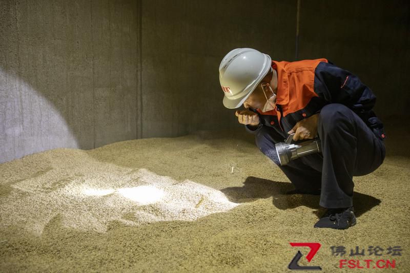 佛山市糧食儲(chǔ)備庫內(nèi)工人為保障稻谷安全,主要檢查是否出現(xiàn)蟲害、發(fā)霉等問題。