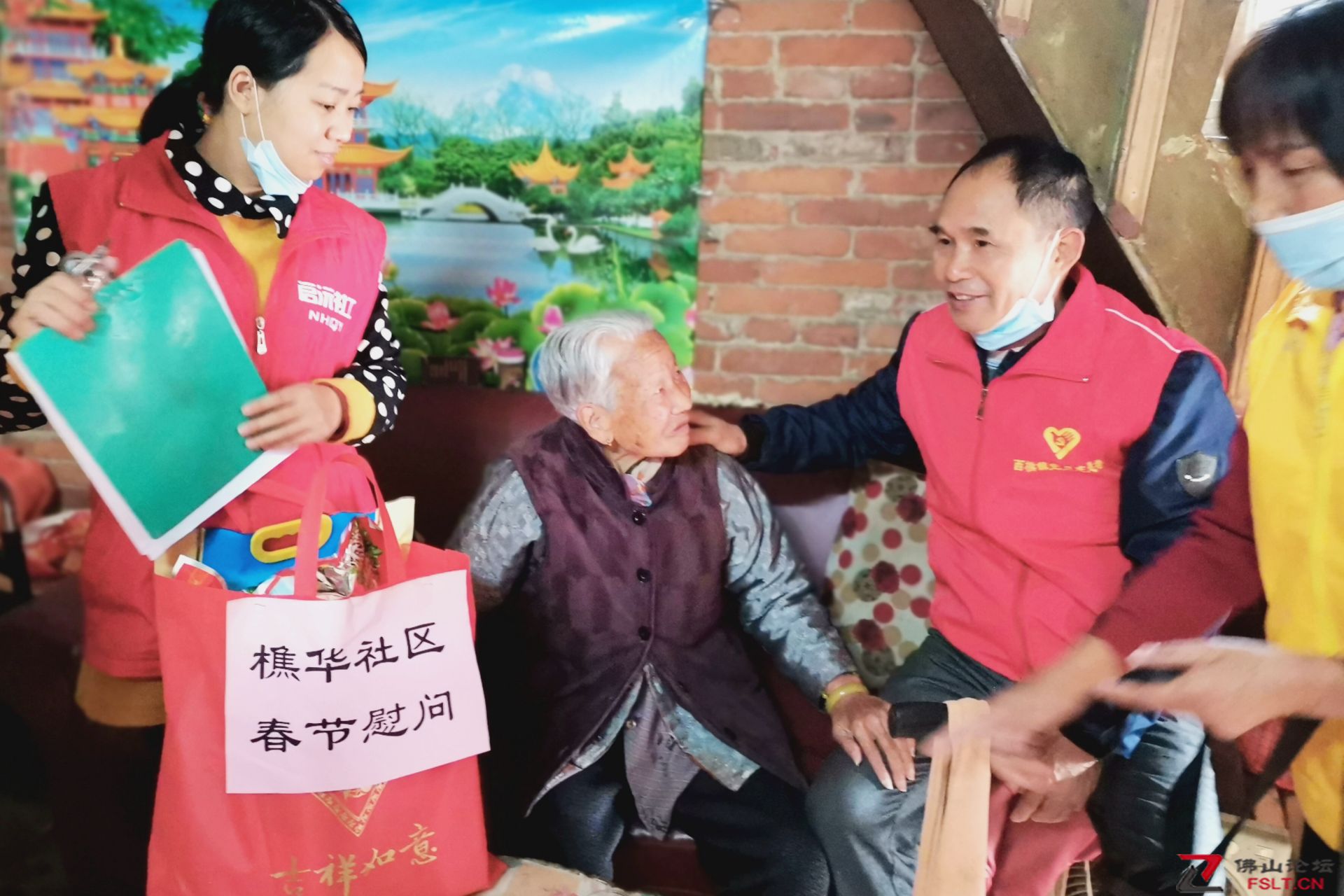 黃伍根(左二)作為志愿者走訪轄區(qū)孤寡老人。 /佛山市文明辦供圖