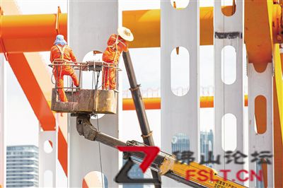 14日,連接禪城和佛山新城的東平大橋上,橋梁維護人員頂著烈日開展高空作業(yè)。/佛山日報記者符詩賀攝