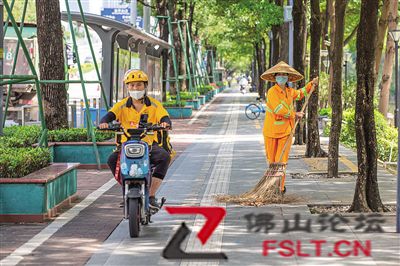 14日,禪城區(qū)嶺南大道上,環(huán)衛(wèi)工人正在打掃街道落葉。/佛山日報記者符詩賀攝