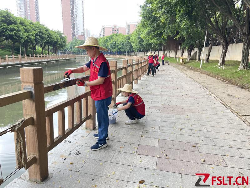 三水區(qū)西南街道橋頭社區(qū)黨群志愿者參與河堤護(hù)欄修復(fù)工作。/社區(qū)供圖