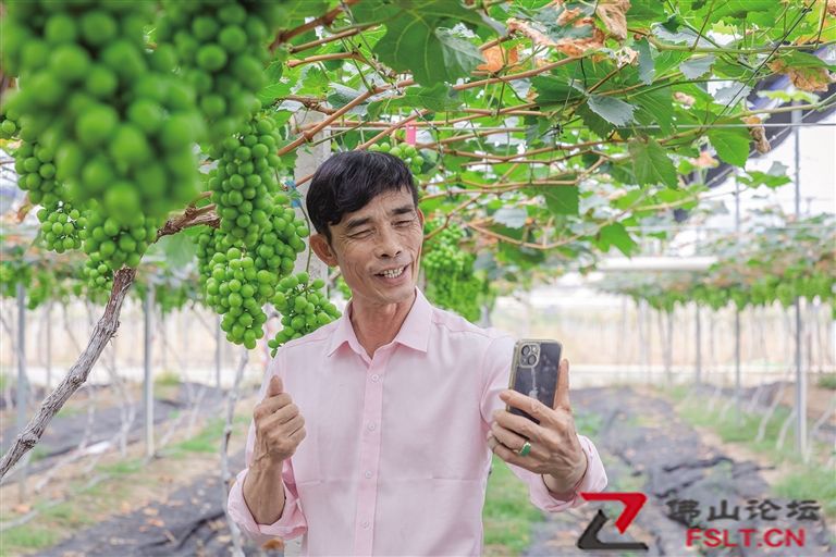 5月24日,記者來到位于中社村村后的白坭和中盛農(nóng)業(yè)生態(tài)園。在專為種植葡萄而搭建的溫室大棚內(nèi),數(shù)名工人正在打理植株,一位穿著淺色襯衫的清瘦男子正在葡萄藤下錄制視頻:“今天介紹的這個是陽光玫瑰,計(jì)劃在七月份上市。”在他身后,掛滿枝頭的陽光玫瑰翠綠欲滴,盈盈動人。