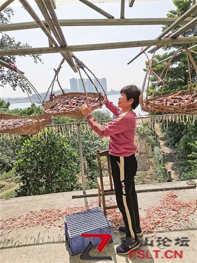 每年秋冬,富興隆漁村餐廳后的菜地就成為臘鴨扎食材的晾曬場(chǎng)。圖為李桂英在晾曬臘鴨扎。/受訪者供圖