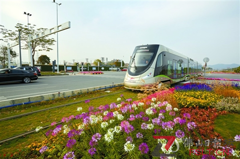 高明有軌電車駛過體育中心站。(資料圖片)/佛山日報(bào)記者呂潤致攝