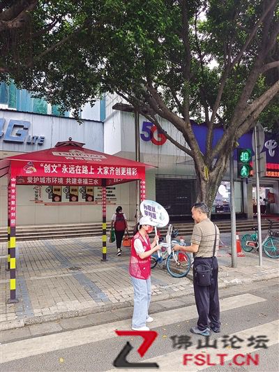 三水西南街頭,志愿者提醒市民做好個人防護。/三水區(qū)文明辦供圖