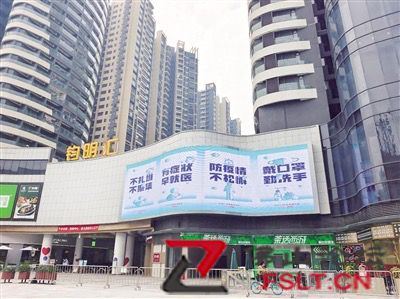 三水鈞明匯的LED大屏正在播放防疫海報。/三水區(qū)文明辦供圖