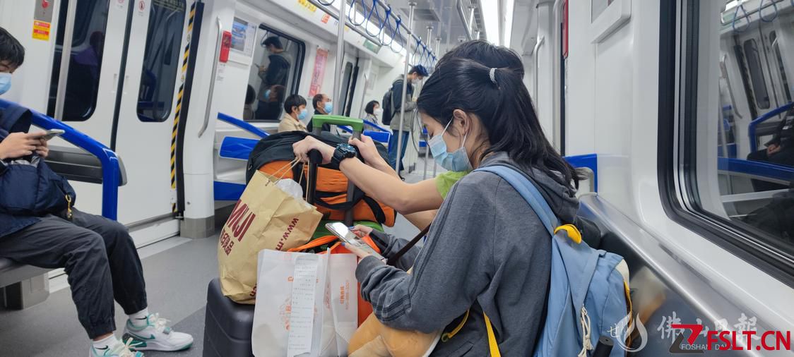 開通首日,兩名來(lái)自肇慶的乘客提著行李箱搭乘到3號(hào)線首通段,準(zhǔn)備前往順德歡樂(lè)海岸游玩。/佛山日?qǐng)?bào)記者周龍鳳攝