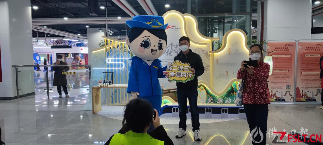 開通首日,市民前往3號(hào)線首通段打卡,與佛山地鐵吉祥物“藍(lán)精靈”拍照合影。/佛山日?qǐng)?bào)記者周龍鳳攝